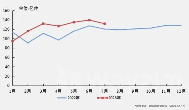 國家郵政局監(jiān)測數(shù)據(jù)顯示,2023年1月~7月,郵政行業(yè)寄遞業(yè)務(wù)量累計完成873.7億件,同比增長12.8%。其中,快遞業(yè)務(wù)量(不包含郵政集團包裹業(yè)務(wù))累計完成703.0億件,同比增長15.5%。2023年郵政行業(yè)寄遞業(yè)務(wù)量較2022年顯著提升。